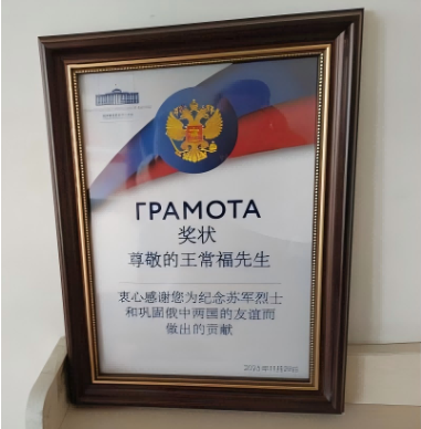 今年,我还荣幸地得到俄罗斯驻华大使馆颁发的奖状,这是对我几十年为中俄友谊鼓与呼的肯定,也证明我为这一友好大厦增了砖添了瓦。同时,我还干休所第十一党支部评为先进工作者并发奖金。