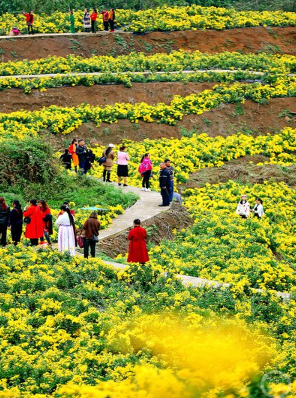 山绿了,生态得到改善,为王家坝村带来了新的生机。王家坝人“不知足”,既要生态美,还要生活富,走出了一条鱼和熊掌兼得的路。2019年,村里引进了观赏价值和经济价值“双高”的金丝皇菊种植项目,建立金丝皇菊种植基地。在采煤沉陷区复垦的土地上,几百亩菊花竞相绽放,如金色的海洋般绚烂,放眼望去,一朵朵金黄色的花朵硕大饱满,摇曳生姿,好似给大地披上了一层“黄金甲”。金丝皇菊经济效益十分可观,村民们不仅可以通过土地流转获得租金,还能在菊花基地务工,一个月收入近3000元。“以前煤灰沾在脸上洗不掉,现在菊花香熏得人心里甜。”村民李大姐捧着刚采摘的菊花,笑得合不拢嘴,“如今在家门口上班,不仅收入稳定,还能照顾家人,一举两得。”