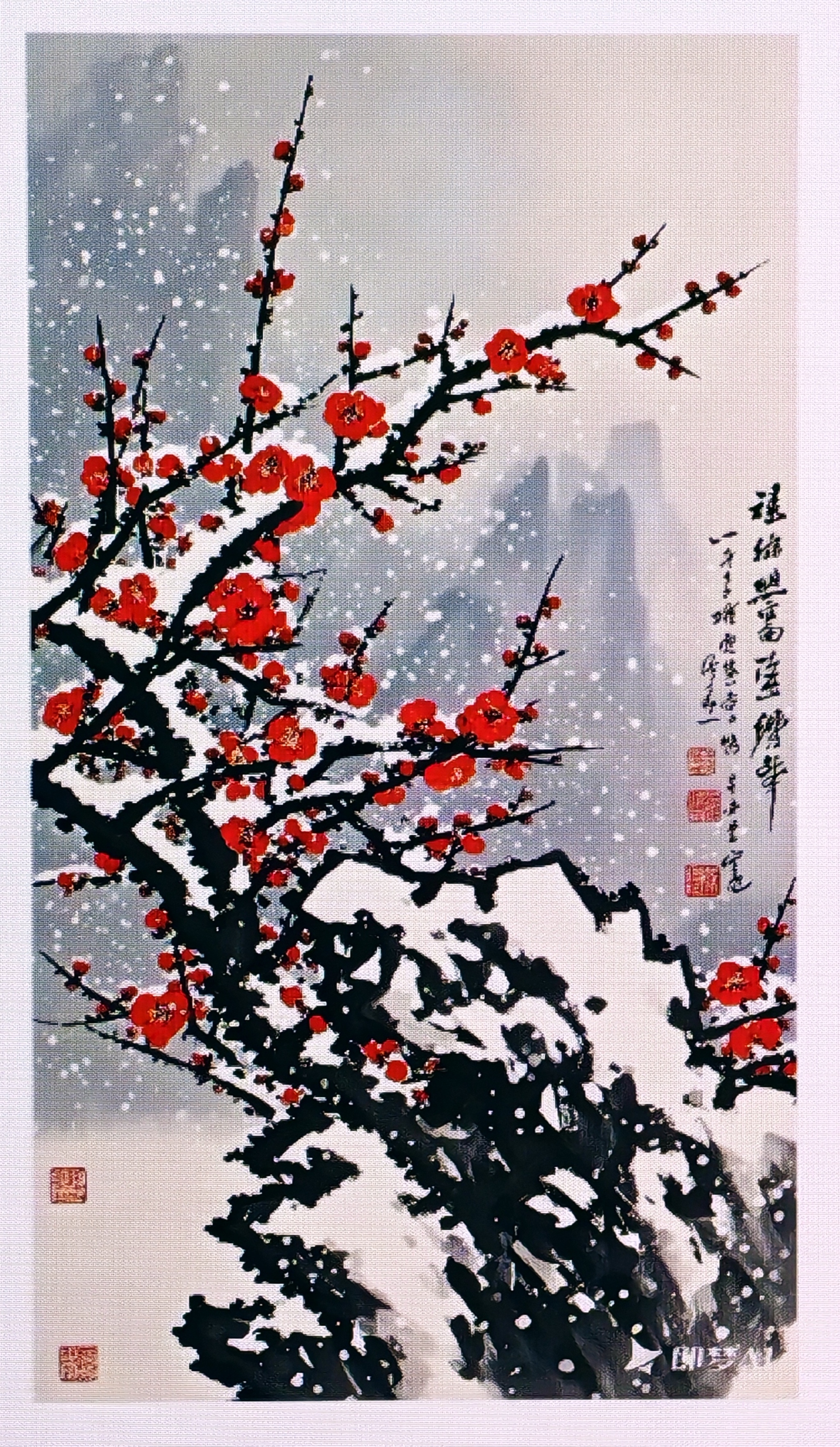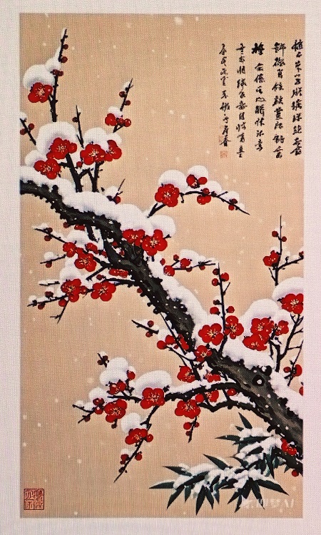 古人写雪,往往写到梅。“雪似梅花,梅花似雪。似和不似都奇绝。”(吕本中《踏莎行·雪似梅花》)这三句词,描绘了雪花像梅花,梅花像雪花。两种花,在寒冷的冬日里形相似、色相近,而质相异,神相别。因而,词人以“似”与“不似”写出了梅与雪交相辉映的奇绝之景。梅花,一生冰雪舞春风,是我国传统名花之一。她,冰清玉洁、傲骨香肌、高标逸韵,以其“独先天下而春”却又不争春的崇高品格,格外引人喜爱。因此,历史上不仅有许多人爱梅成癖,而且有许多诗人为之命笔吟咏,写出了千古名篇。如: