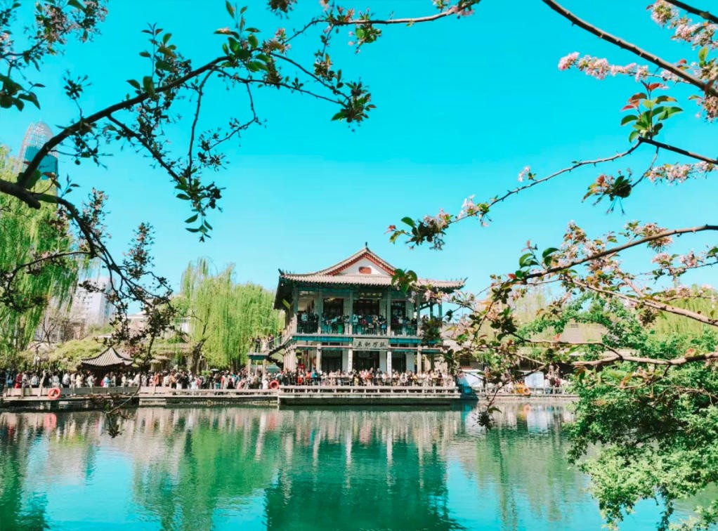 趵突三窟的泉水,汩汩上涌,翻涌如碎雪堆银,又似一尊尊灵气汇聚的玉壶,盛着这一城温软的春晴。阳光洒在泉面上,波光粼粼,折射出细碎的金光,恰如赵松雪笔下的《鹊华春色图》,将春晴的澄澈、泉城的灵秀,一笔一画晕染开来,藏不住的生机与温婉,漫过亭台,漫过街巷,漫进每一个寻春人的心底。历下亭的古意,顺着青石板的苔痕漫上来,苔痕是深绿的,藏着岁月的厚重,也藏着文人墨客的才情。