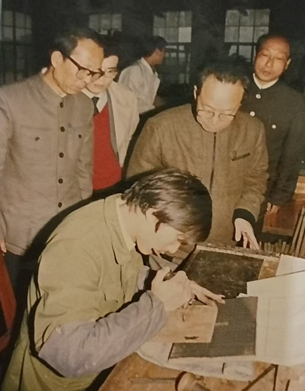 图二:管世俊(后右一)接待来宾参观扬州古籍刻印社