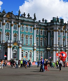 到达彼得堡第二天,早餐后,前往参观世界四大美术博物馆之一的埃尔米塔什博物馆(也称俄米塔希博物馆)——冬宫。没想到我们刚好遇上了在圣彼得堡宫殿广场前举行的2015年“白夜”国际26界马拉松比赛。广场中央有高耸入云的亚历山大纪念柱。我们看见广场上聚集了很多人,看见不同肤色不同年龄的男女运动员聚集在跑道的起点,看见跑道两边挤满了衣着鲜艳的观众,看见举着不同小旗的导游带着队伍穿过广场,还看见穿着制服的帅气警察在巡逻。除此以外,最引人注目的还是冬宫。
