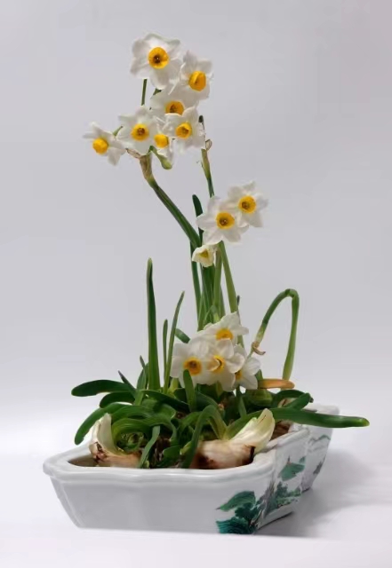 水仙花的雕刻在我国流传已久,记得若干年前有位友人赠我一株。刀法甚是了的,既要不伤待挺出的芽孢,又能令其开出清香的花朵,还有美丽的造型,实在是令人拍案叫绝。有此技艺者当前已经不多了,如何发扬广大更是当务之急!