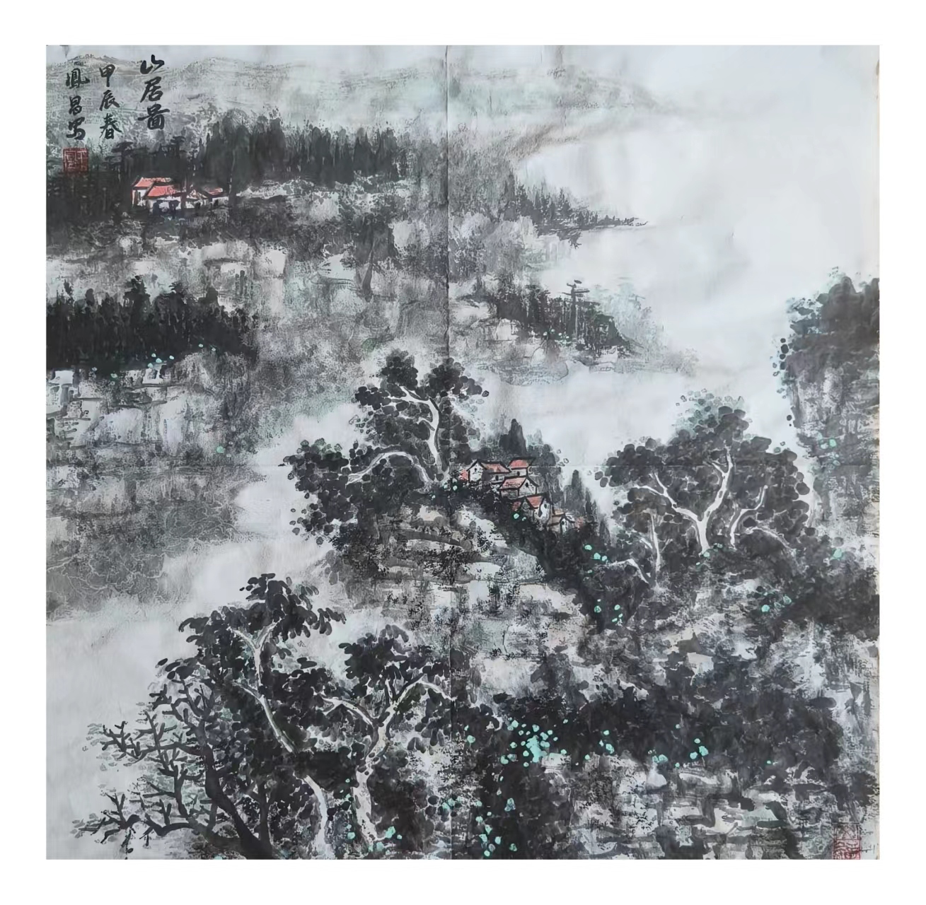 欣赏王凤昌绘画作品《山居图!挥彩拔墨妙笔生,绿树白云在画中!