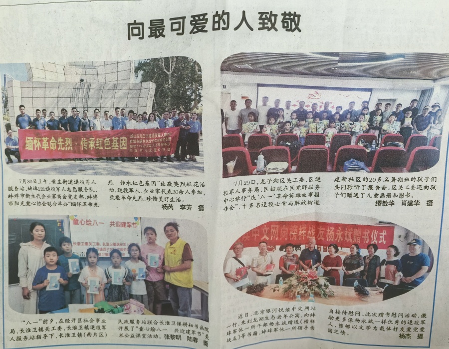 7月14号上午,银河悦读中文网站长李玲、常务副站长胡泊、总编吕漪澜等网站高管一行,冒雨来到蚌埠市龙湖生态养老公寓向军休干部、军旅书法家、第三届榜样战友杨永斌赠送《榜样战友》《正义必胜》书藉。蚌埠第一干休所负责同志参加赠书仪式。《榜样战友》是李玲主编、罗援将军题写书名。全书共收录220名全国各地“退役不退色、永当排头兵”的退役军人感人事迹。今年89岁的杨老十分开心并为银河悦读中文网赠送一幅书法作品“银河璀璨,红色文化燃热血;阅读缤纷,革命精神铸忠魂”。赠书仪式结束后,李玲站长与第一干休所负责人、龙湖生态养老公寓院长孙丽萍就红色文化宣传,融合养老等问题进行座谈,并对今后的合作意向做了探讨。