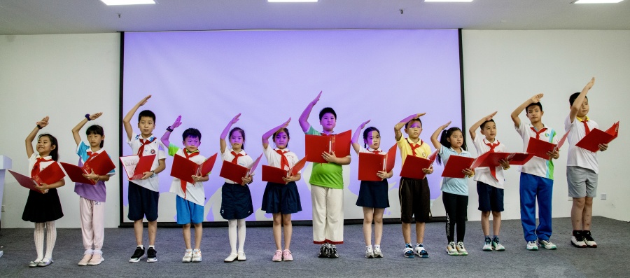 首先出场的是北京日报集团读者俱乐部小读者团的代表,他们为参会的领导、首长和特邀嘉宾佩戴红领巾。红领巾是国旗的一角,烈士的鲜血染成,献上红领巾,意味着对祖国、对先烈和前辈的敬重。历史与未来交汇,双向奔赴,交相辉映。