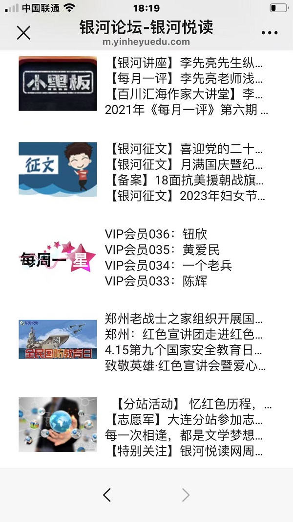 三、银河悦读网站手机版首页的右上角有三个红色的小短线,点击它可以出现相关栏目内容:“长篇小说”“长篇纪实”“短篇小说”纪实文学“文学评论”“散文”“杂文”“游记”“诗歌”“楹联”“剧本”“学生作文”“书法”“绘画”“摄影”“【银河论坛】”。