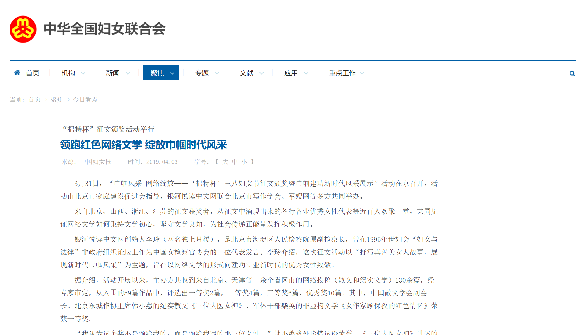 2019年,被中国妇女报称誉“领跑红色网络文学”。