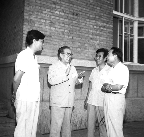 黄华副委员长(左二)与新华出版社社长解力夫(右一)、新华社著名记者江山(左一)等,畅谈斯诺、艾黎、爱泼斯坦等国际友人支持中国抗日斗争的感人故事。