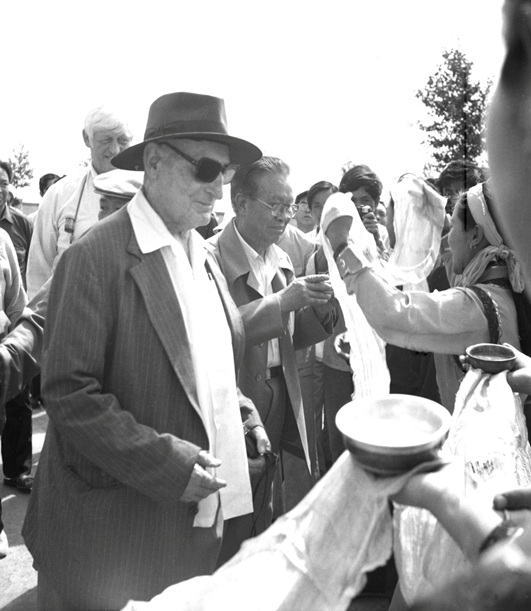 萨拉齐群众向艾黎(左一)等国际友人和黄华副委员长敬献哈达。(1985年7月19日摄于内蒙古萨拉齐,用海鸥双镜头120相机拍摄)