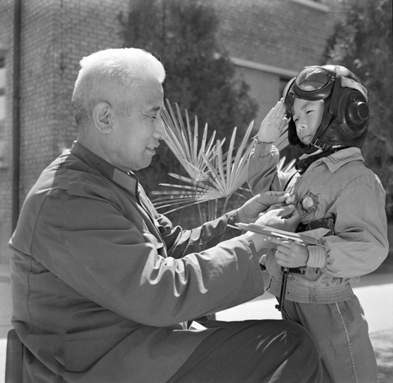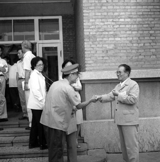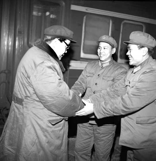 1984年正月初四,铁道部长陈璞如(左),专程来到当年“敌后武工队”打鬼子的战场,向空军某部官兵拜年。经军地双方一年多的努力,空军某部与保定火车站,创建了闻名全国的“双拥模范站”,成了中央电视台、中央人民广播电台和人民铁道报的头条新闻,吸引了全国近30家省(区)报社的领导到保定火车站取经。陈部长向部队长张均昌(右)、政委王爱义(中)拜年,感谢部队的大力援助。
