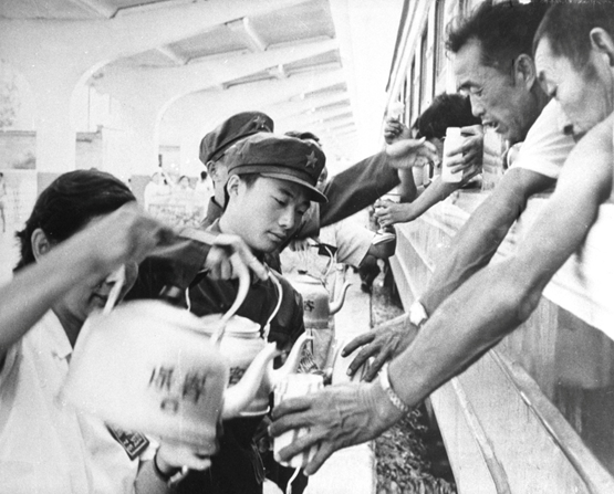1983年空军某部与保定火车站,发扬当年“狼牙山军民团结抗战”的光荣传统,军民同心干,共建文明站,为创建新时代“全国双拥模范城”作出了贡献。这是部队学员和车站员工,为列车上的旅客送水。