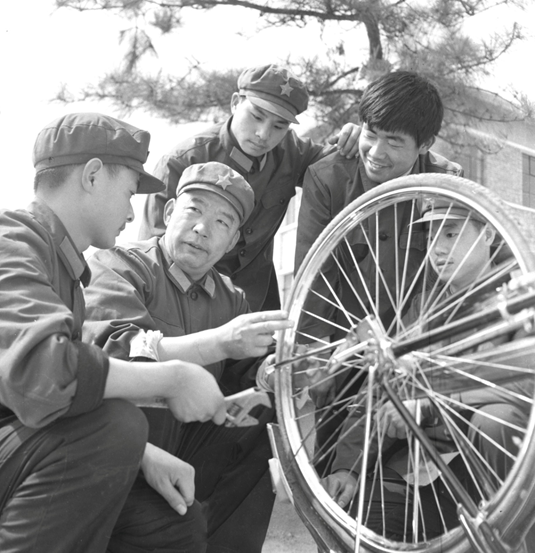 空军保定干休所抗战老兵刘彥海(左二),退休不褪色,常年为群众义务修理自行车,并将技术传授给部分战士和社会青年,被北京军区空军评为“学习雷锋先进个人”。中央人民广播电台多次报道了他的先进事迹。