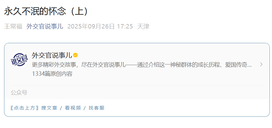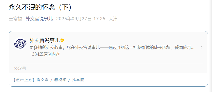 祝贺银河退休武官王常福佳作《永久不泯的怀念(上、下)》刊登《外交官说事儿》