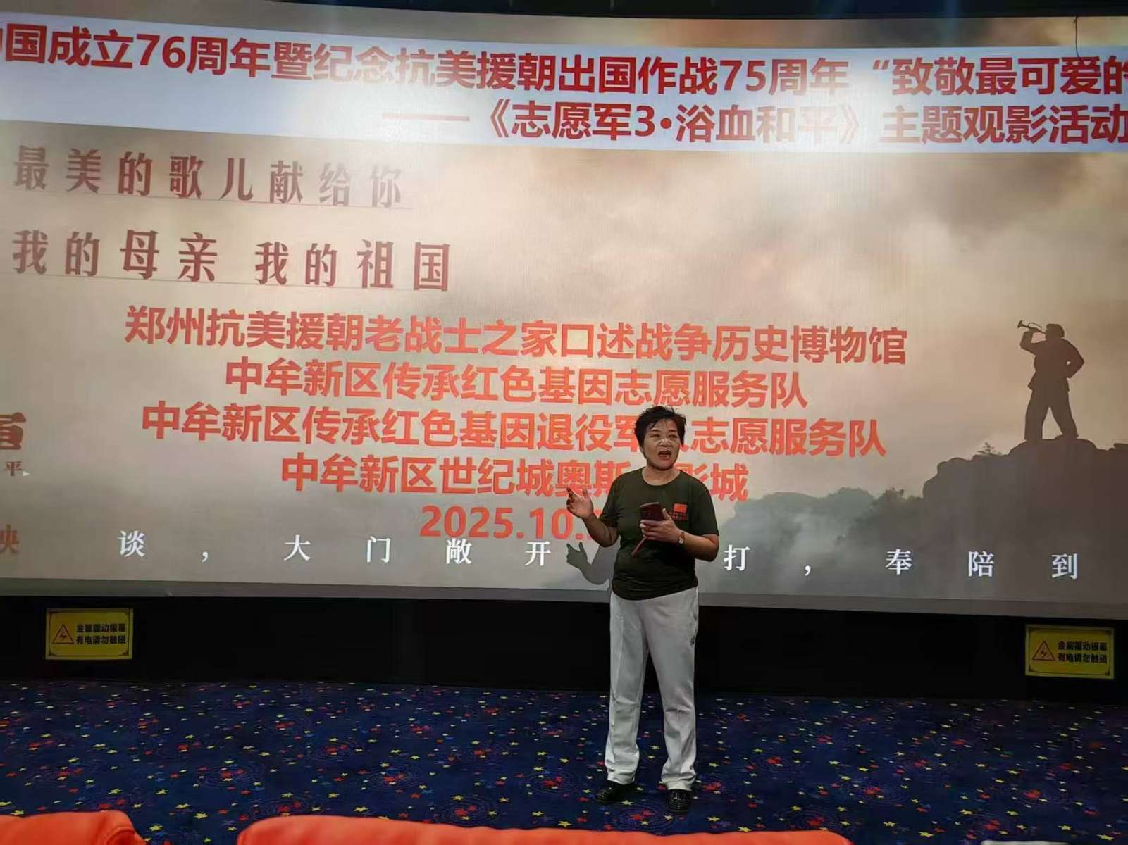 正式观影前,郑州抗美援朝老战士之家口述战争历史博物馆馆长、传承红色基因志愿服务队队长张爱兰致辞,她说,今天,我们怀着无比崇敬的心情,即将共同观看电影《志愿军:浴血和平》。这部电影,是献给新中国成立76周年的庄严礼物,更是对抗美援朝75周年的深情致敬。