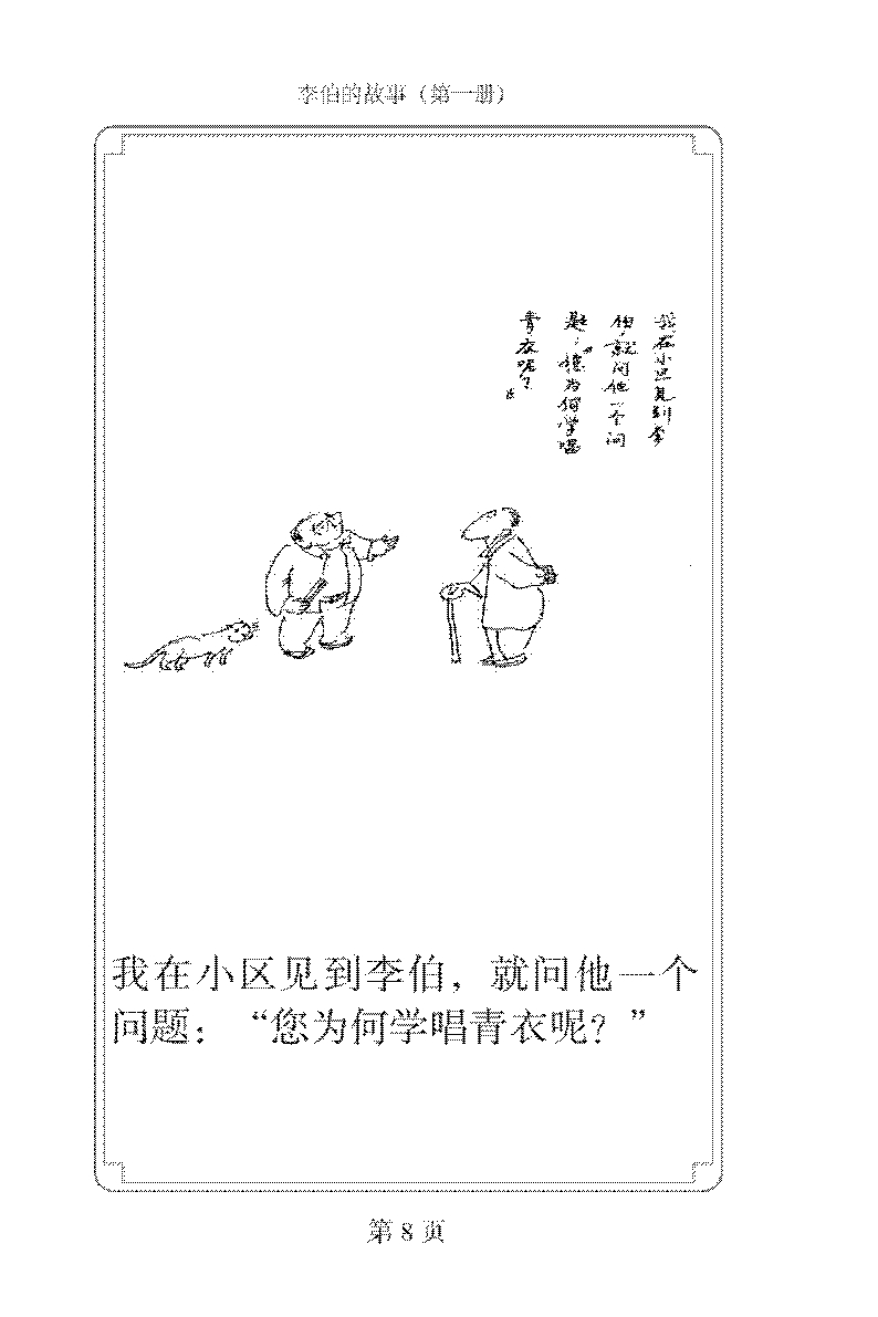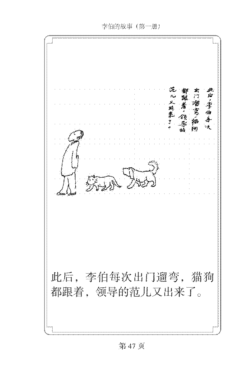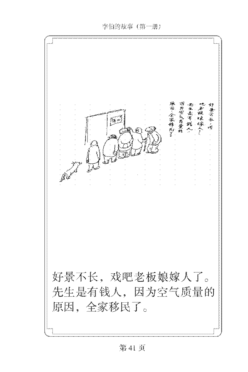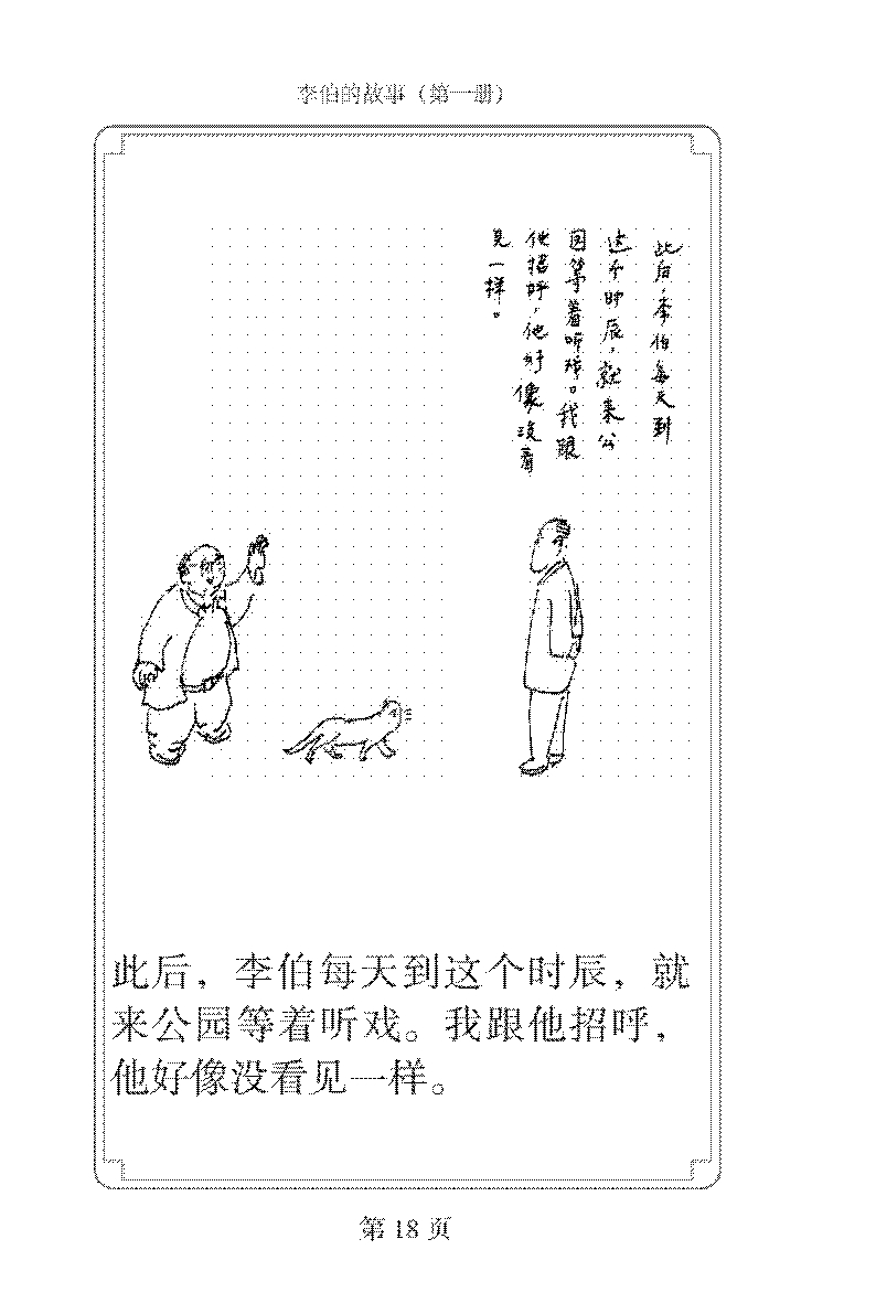 吴志攀老师的漫画《李伯的故事》,以简洁的线条、简洁的笔触,讲述了一个令人嘘唏不已的故事:李伯是位离休干部,故事从他爱听爱唱京剧起笔,讲到李伯母亲曾经是京剧团大青衣WG遭受冲击,从此留下遗嘱,子孙永不再唱戏!骨子里喜欢京剧的李伯只好唱唱样板戏,偶然在公园遇见吊嗓子的姑娘,唱的正是母亲最爱唱的“四平调”,于是天天去公园候着,结果发现姑娘“失踪”了,后来,偶然在“戏吧”又遇唱京剧的姑娘,生活的重心回来了,听戏聊戏成了生活中的亮点,但好景不长,偏姑娘又嫁入豪门,只能听老唱片过过戏瘾。每天遛弯,后面跟着猫儿和野狗“翠花”,似乎又有了“领导范儿”?不知何时野狗“翠花”怀孕了,一窝生下五个狗仔,一家人帮着疏散人口,只留下了“建设”,带着猫儿、翠花和建设遛弯的李伯,看上去优哉游哉,蛮好,原以为故事讲到这里就该画句号了,没想到最后起了“范儿”——正在遛弯的翠花与她的“丈夫”不期而遇,两相亲热,结果被“丈夫”的主人费力抓开。“世间有多少真情就是被这样分开了”。故事写到这儿戛然而止。读者却刹不住车,心里忍不住泛起波澜,浮想联翩。