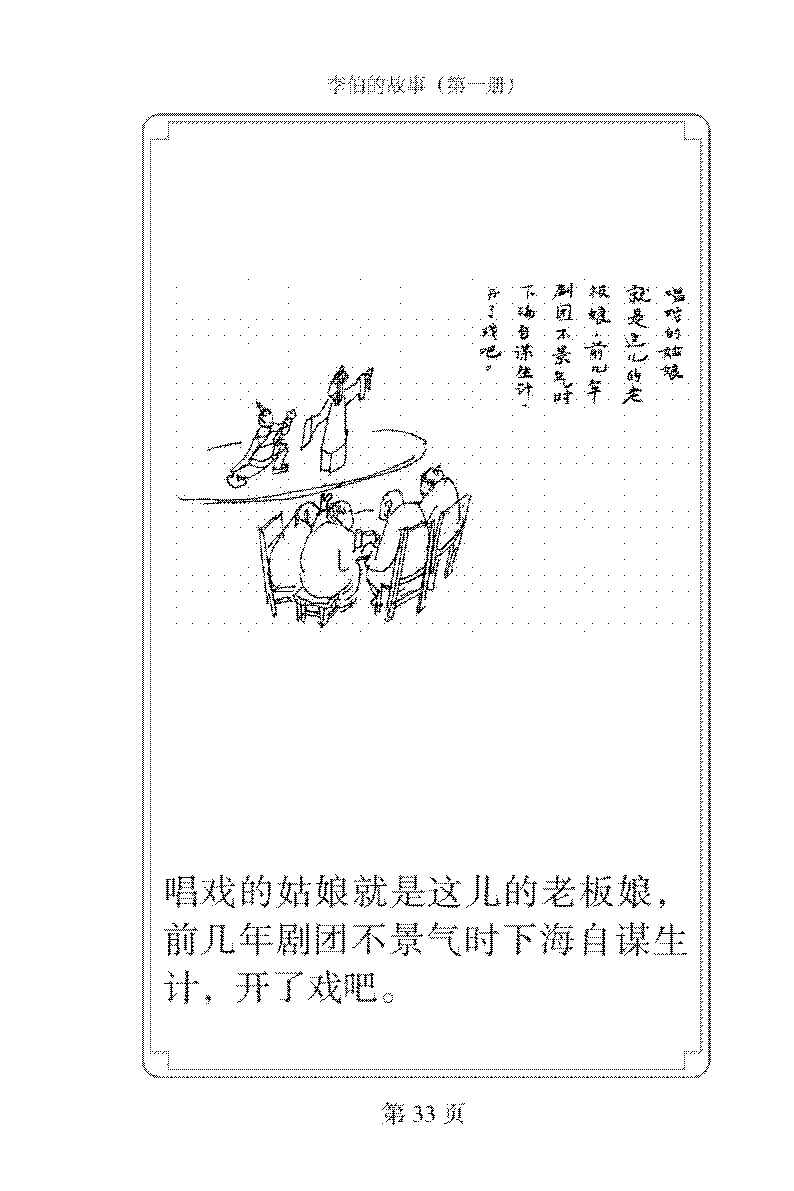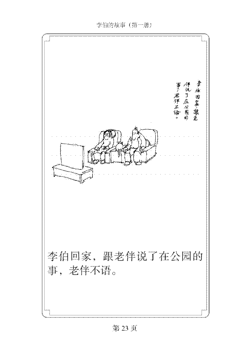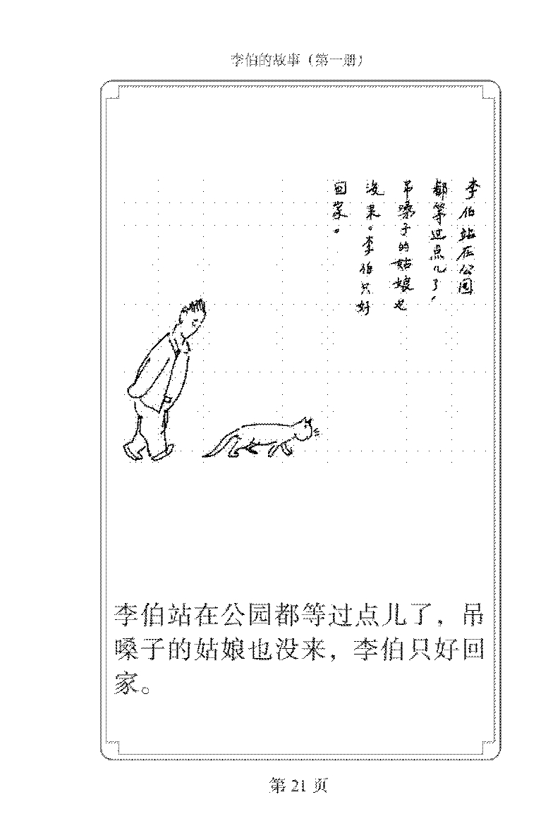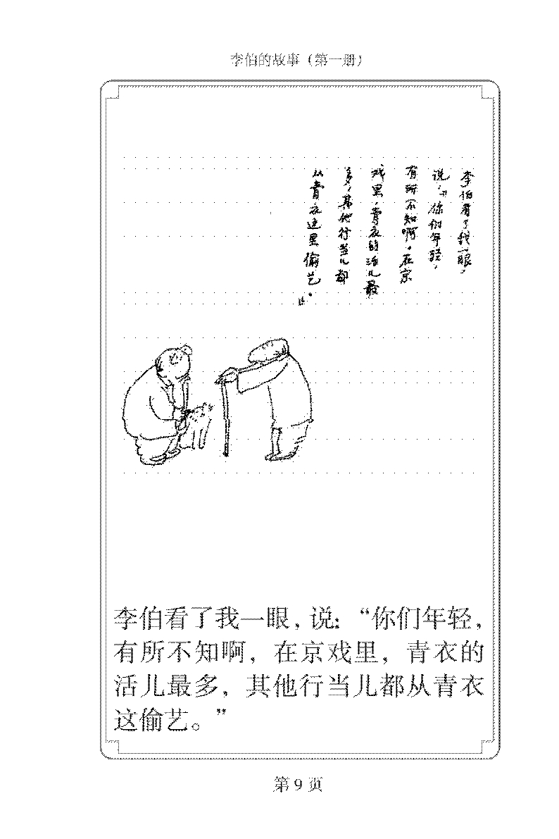 吴志攀老师的漫画《李伯的故事》,以简洁的线条、简洁的笔触,讲述了一个令人嘘唏不已的故事:李伯是位离休干部,故事从他爱听爱唱京剧起笔,讲到李伯母亲曾经是京剧团大青衣WG遭受冲击,从此留下遗嘱,子孙永不再唱戏!骨子里喜欢京剧的李伯只好唱唱样板戏,偶然在公园遇见吊嗓子的姑娘,唱的正是母亲最爱唱的“四平调”,于是天天去公园候着,结果发现姑娘“失踪”了,后来,偶然在“戏吧”又遇唱京剧的姑娘,生活的重心回来了,听戏聊戏成了生活中的亮点,但好景不长,偏姑娘又嫁入豪门,只能听老唱片过过戏瘾。每天遛弯,后面跟着猫儿和野狗“翠花”,似乎又有了“领导范儿”?不知何时野狗“翠花”怀孕了,一窝生下五个狗仔,一家人帮着疏散人口,只留下了“建设”,带着猫儿、翠花和建设遛弯的李伯,看上去优哉游哉,蛮好,原以为故事讲到这里就该画句号了,没想到最后起了“范儿”——正在遛弯的翠花与她的“丈夫”不期而遇,两相亲热,结果被“丈夫”的主人费力抓开。“世间有多少真情就是被这样分开了”。故事写到这儿戛然而止。读者却刹不住车,心里忍不住泛起波澜,浮想联翩。