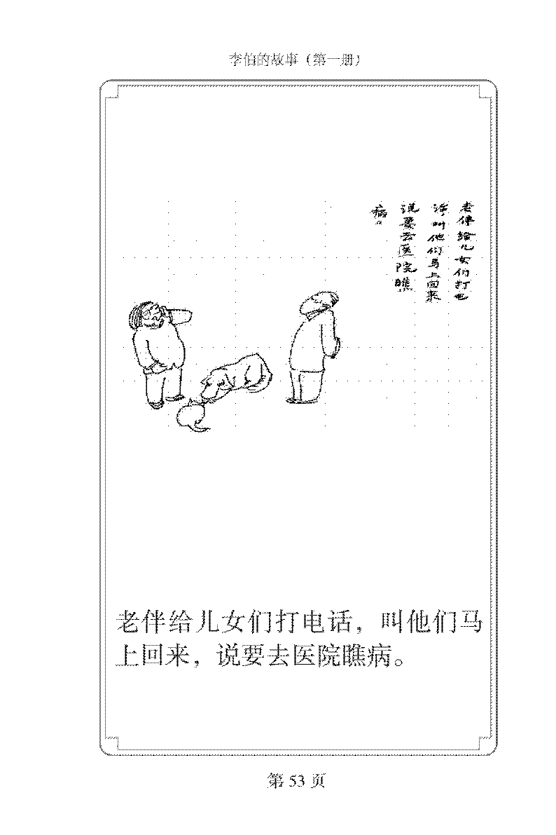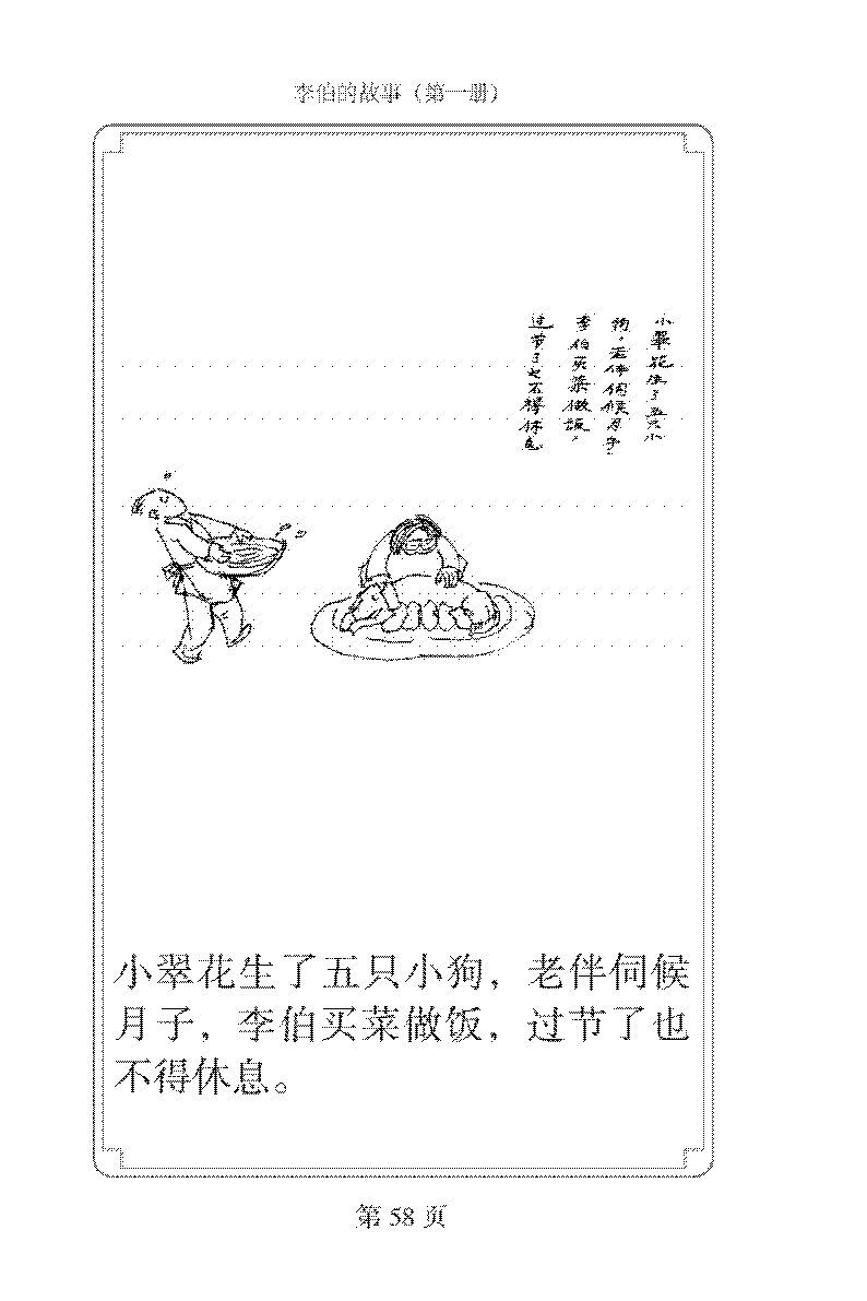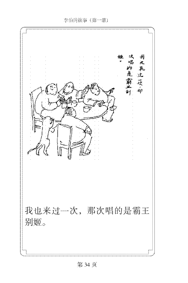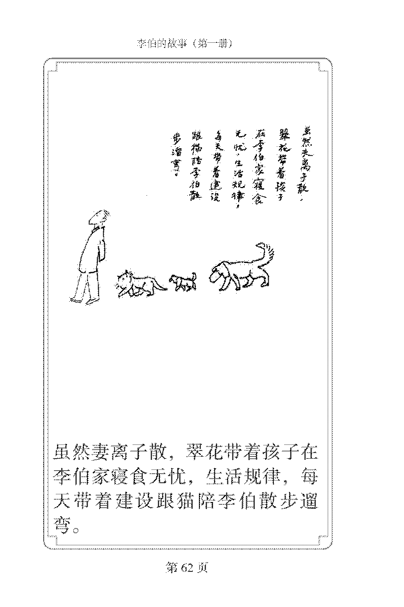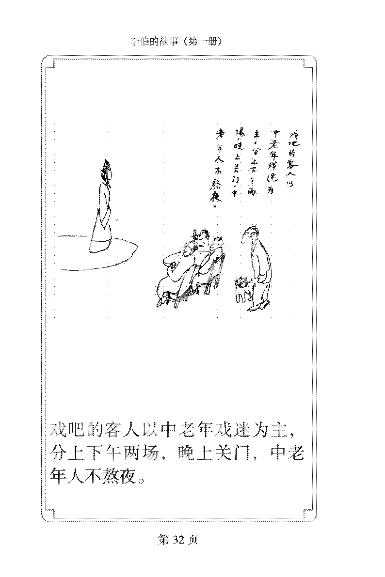 如果说《三毛流浪记》是对时代的宏大叩问,那《李伯的故事》便是对寻常人生的细腻描摹。没有跌宕起伏的剧情,没有轰轰烈烈的冲突,只凭简洁的线条,就讲透了一位离休干部的晚年心事:爱唱京剧,却因母亲曾在特殊年代受冲击而只能藏着喜好;偶然遇见唱“四平调”的姑娘,生活有了亮色,姑娘却嫁入豪门;最后陪着他的,只有猫儿、野狗“翠花”,以及“翠花”与“丈夫”被强行分开的遗憾。故事的结尾很轻——“世间有多少真情就是被这样分开了”,却像一颗小石子,在读者心里激起层层涟漪。