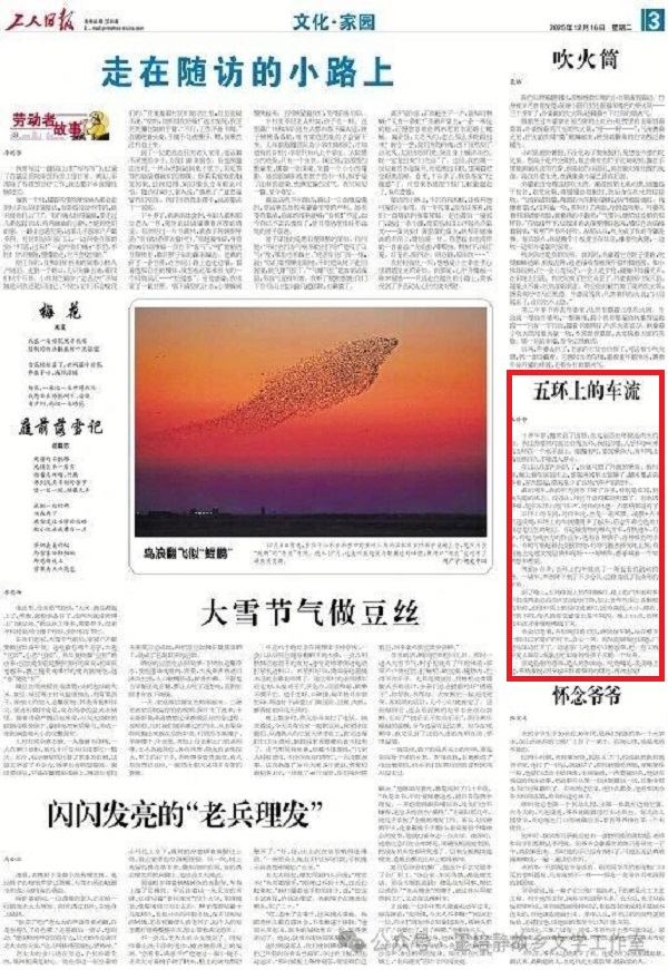 祝贺银河驻站作家王培静散文佳作《五环上的车流》刊登《工人日报》2025年12月16日第三版!