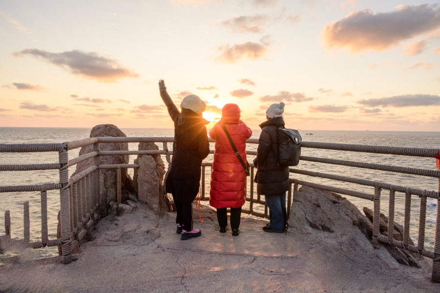 成山头日出的壮阔,构成了本次文旅活动的最大亮点。成山头作为中国大陆海岸最早看见日出的地方,素有“中国好望角”之称,秦皇汉武曾在此祭天拜日,为这片海增添了厚重底蕴。几位摄影爱好者凌晨六点便顶着寒风守候,指尖冻僵也未懈怠。当橘红色朝阳冲破晨雾跃出海面,金色光芒铺满天地,古稀之年的我们情不自禁欢呼跳跃,那一刻,唯有对天地壮阔的敬畏与内心的澄澈留存心间。