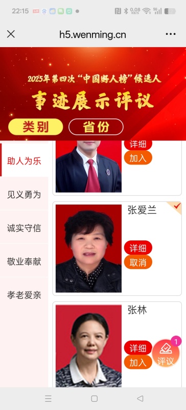 省份(类别→助人为乐)→河南→张爱兰→加入→评议→提交