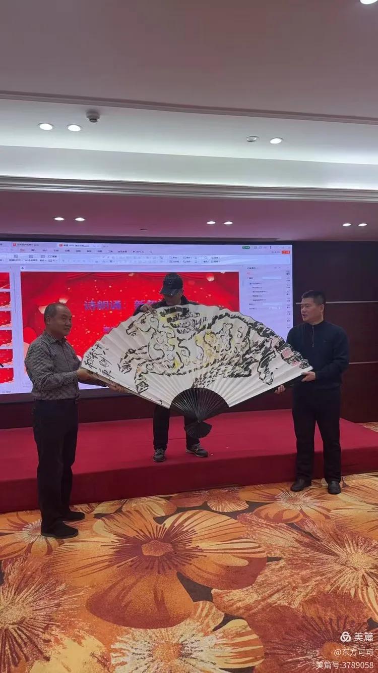 扇画大杜展示现场画的马。