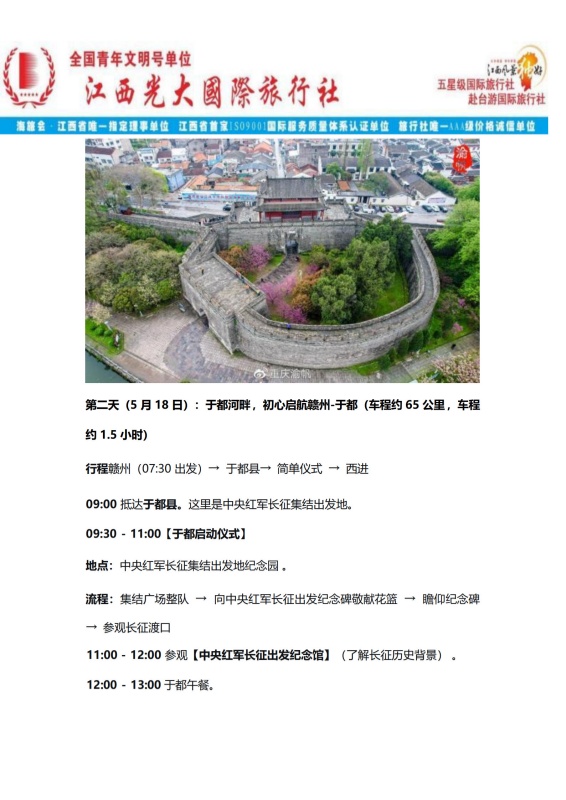 第二天(5月18日):于都河畔,启动仪式。下午赶往汝城县或桂东县入住。