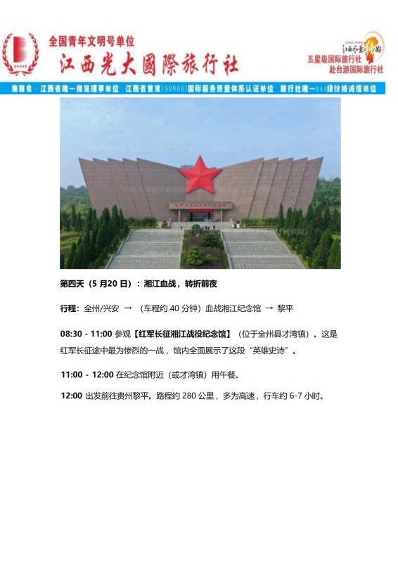 第四天(5月20日):湘江血战,转折前夜,参观血战湘江纪念馆等,晚住黎平