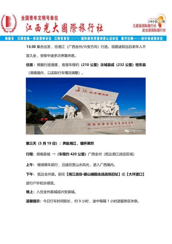 第三天(5月19日):奔往湘江,缅怀先烈。晚住全州县城或兴安县城。