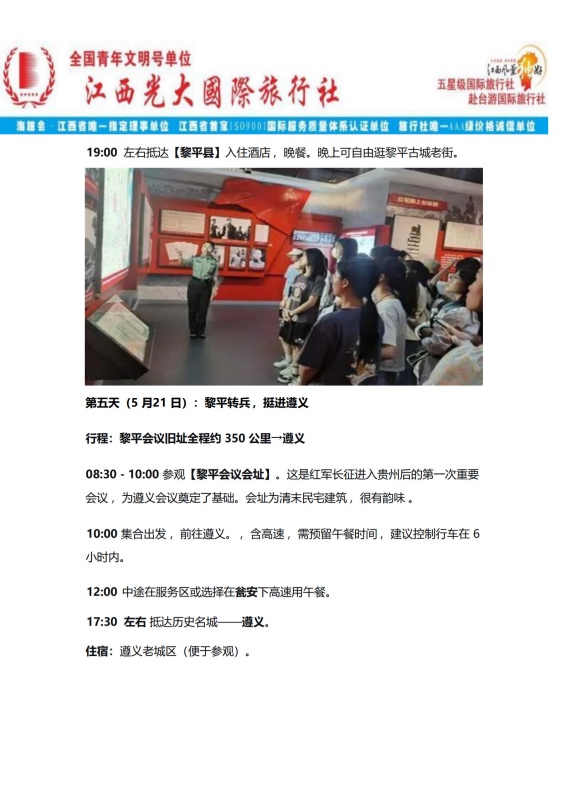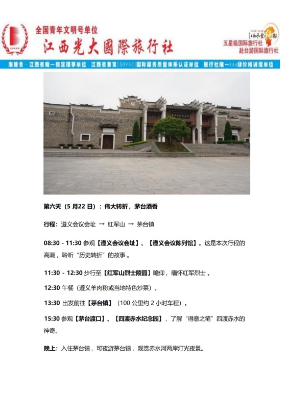 2、可选择只游览江西于都中央红军长征始发地至湖南、广西湘江战役、 黎平会议、遵义前段线路。