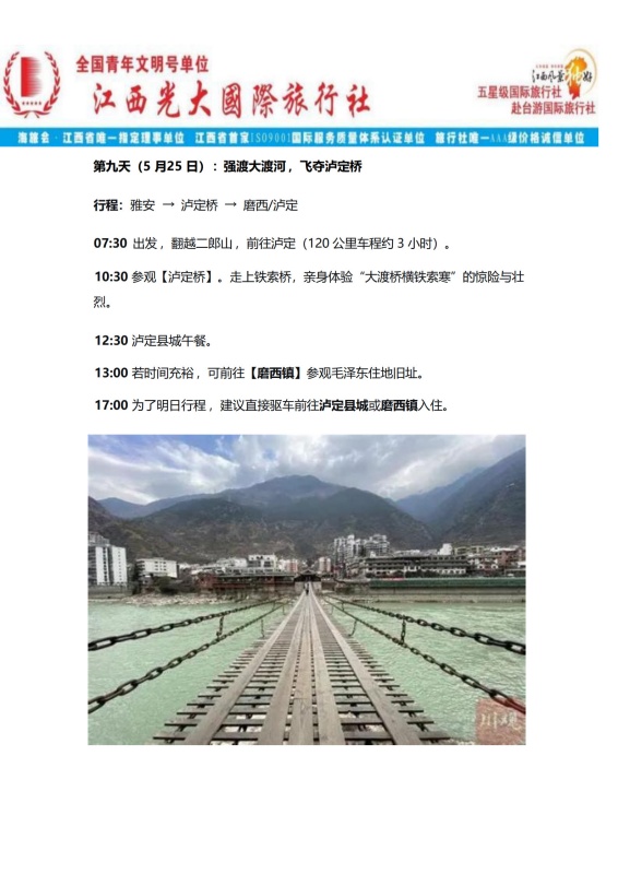 第九天(5月25日):强渡大渡河,飞夺泸定桥,晚住泸定