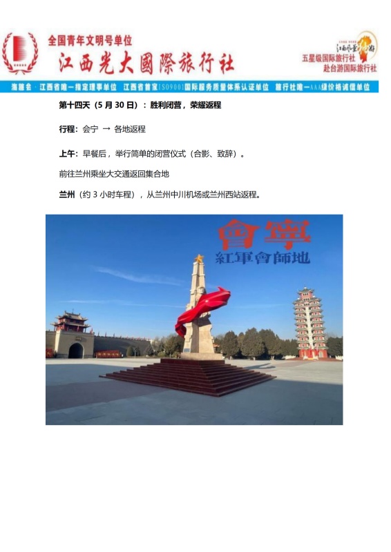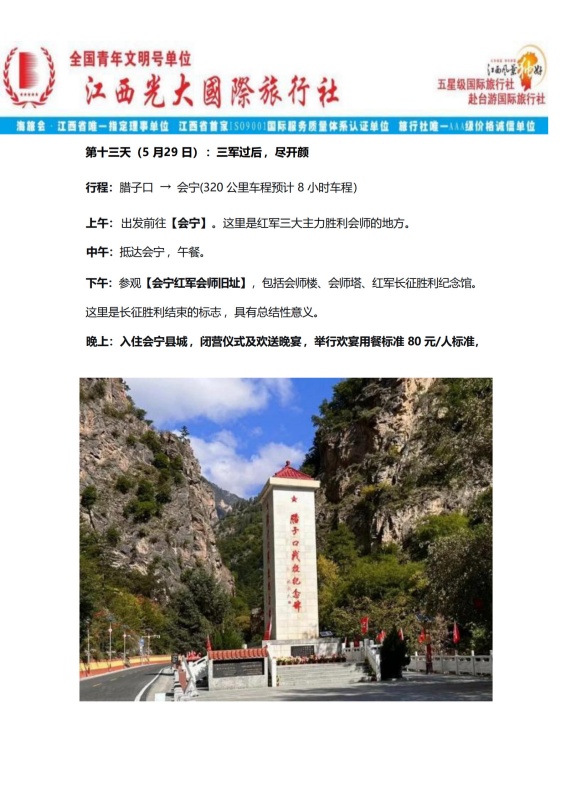 第十三天(5月29日):三军过后尽开颜,晚住会宁县,举行欢送晚宴。