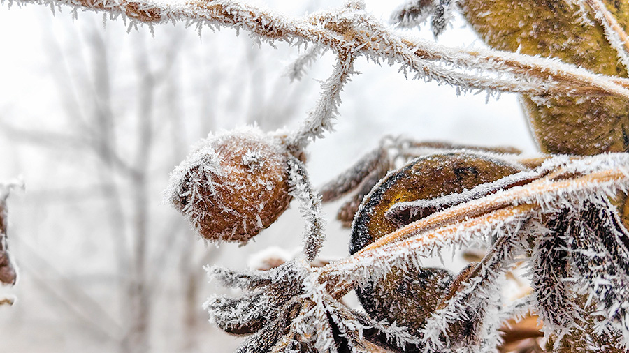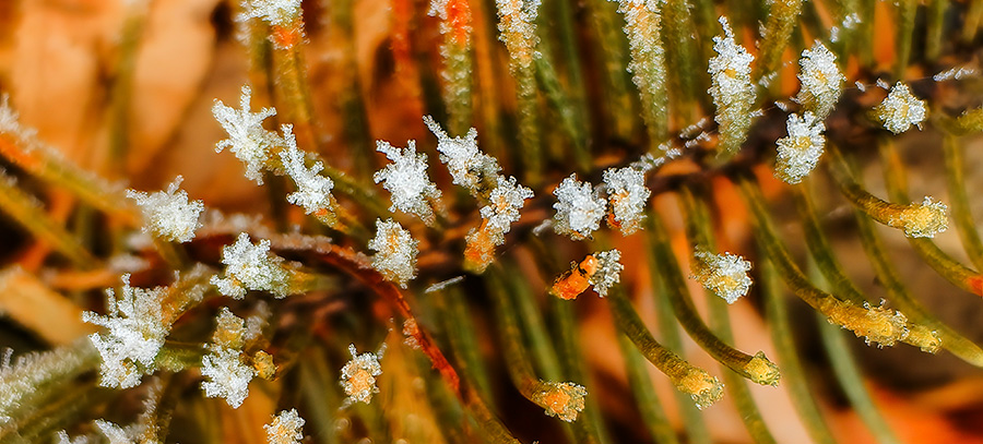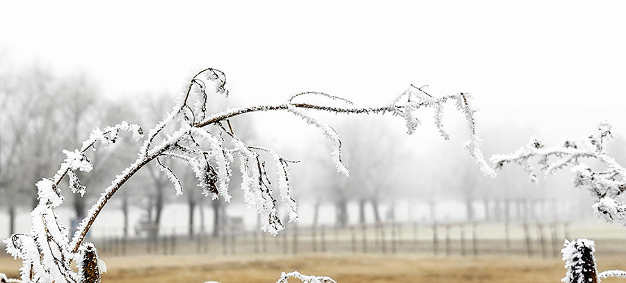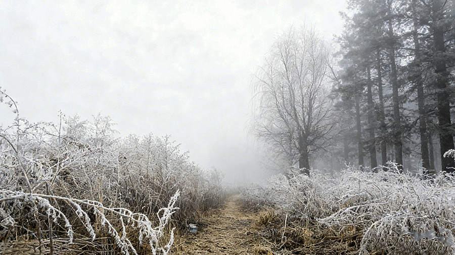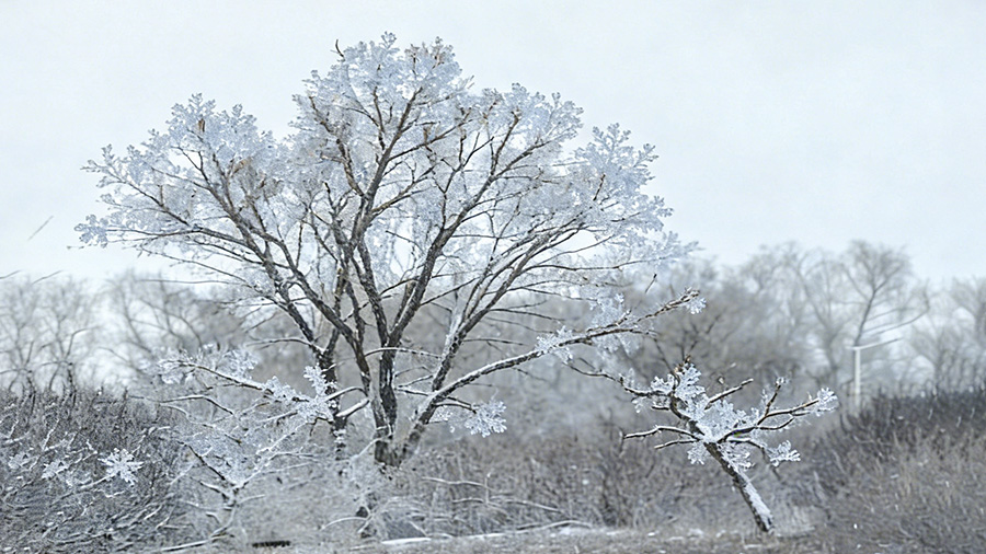 冷风轻佛,冰霜花微微颤动,却依旧牢牢除附在草木之上,那傲然挺立、唯美绽放的恣态,无声地诉说着生命的力量和坚韧。