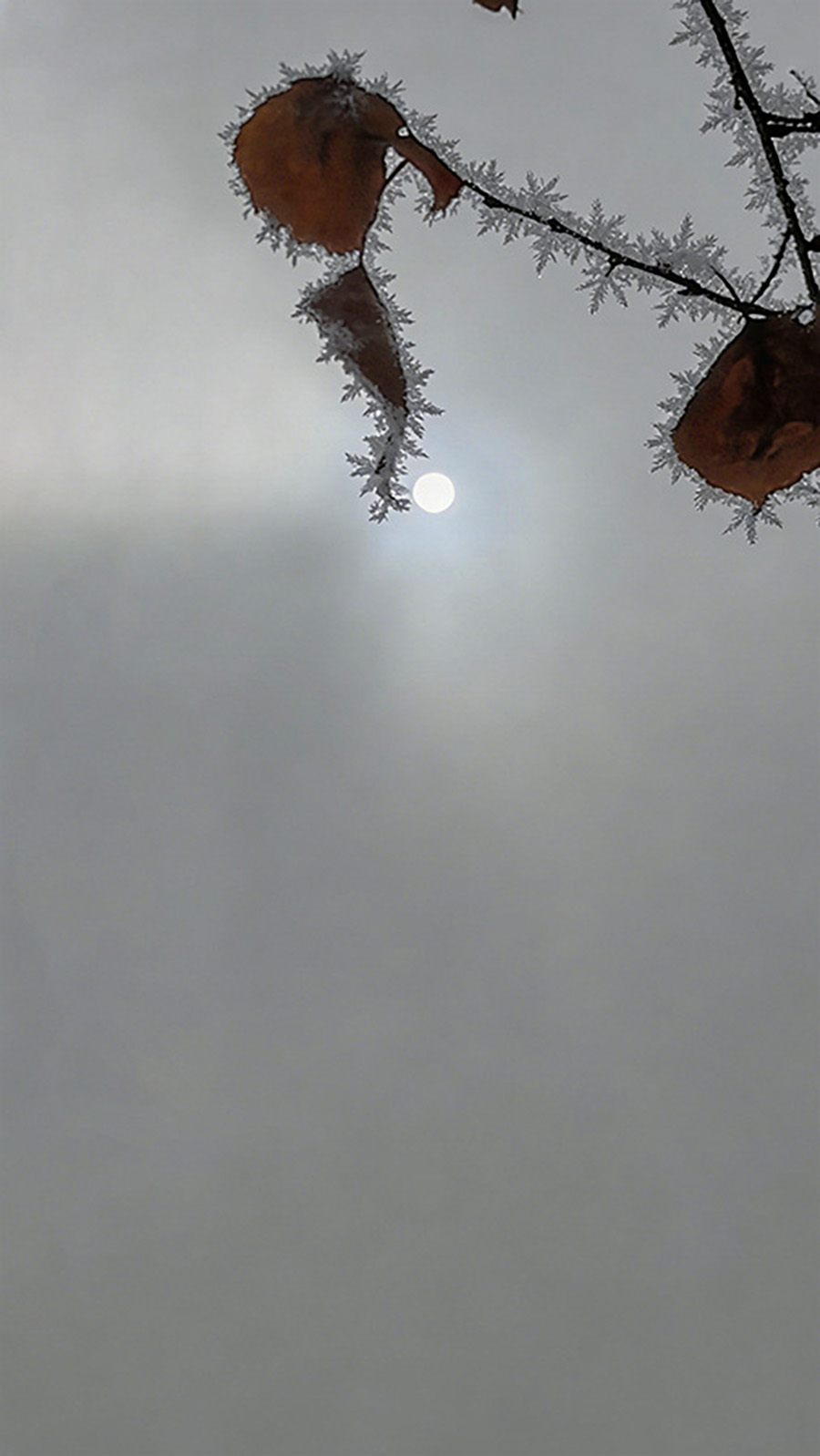 抬眼望去,路边的树木尽数披上冰清玉洁的外衣,枝桠结满了玲珑剔透的冰霜花。那冰霜花似珍珠圆润晶莹,又似水晶般澄澈透亮,一簇簇、一串串缀满枝头。阳光透过薄雾洒下折射出细碎又耀眼的光芒。