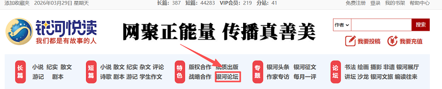 9岁,对人类而言,不过是一枚少年,对一个坚守初心、深耕文学的网络文学平台而言,却是三千多个日夜的坚守与成长。从最初的点点微光,到如今星光灿烂,银河悦读网始终以初心为灯,以文字为桥,记录时代烟火,书写人间情怀。九年风雨兼程,九年薪火相传,未来仍将以文为帆,继续奔赴更辽阔的文学星河,陪伴每一位读者与作者,在笔墨之间遇见更好的自己。