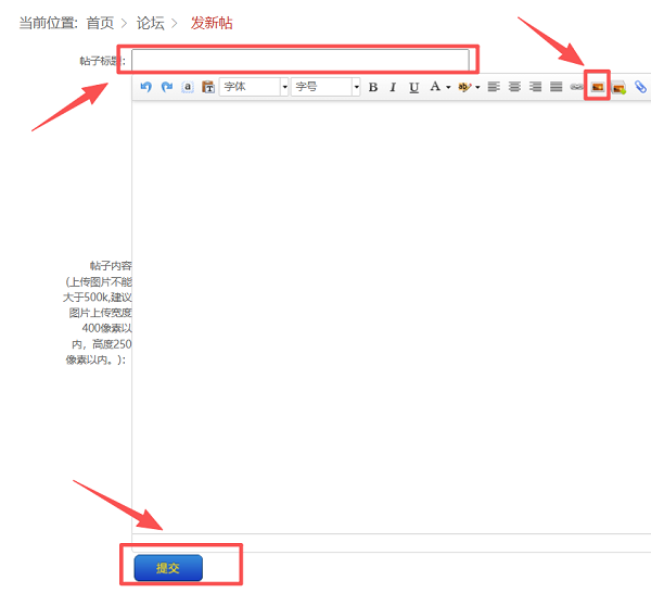 第八步:填写”帖子标题“、上传摄影作品、然后点击”提交“。