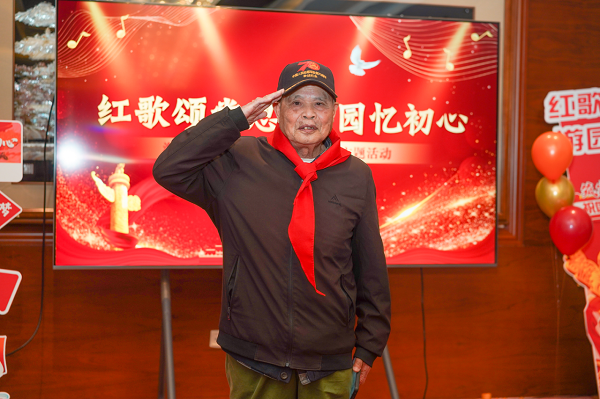 活动伊始,志愿军老兵周学陶精神矍铄地登场。93岁高龄的他,气宇轩昂,中气十足,手持话筒缓缓开嗓:“雄赳赳,气昂昂,跨过鸭绿江……”熟悉的旋律响起,老兵的声音虽略带沙哑,却字字铿锵,穿透时光迷雾,瞬间点燃全场热情。周围的退役老兵们纷纷起身应和,歌声从稀疏到整齐,从低沉到激昂,饱含着保家卫国的热血与对党的赤诚,每一句都承载着烽火岁月的初心,每一个音符都激荡着家国情怀。