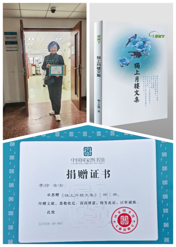 当我和象红从国家图书馆工作人员手中接过捐赠证书的那一刻,仍难掩内心的激动——尽管这已不是第一次捐赠。想到自己的拙作能永久珍藏于国家最高权威图书馆,心中满是欣喜与慰藉。忘不了当年从榕树下管理者手中接过他们精心为我印制的《独上月楼文集》,忍不住热泪盈眶,感恩满怀。十余载光阴流转,数次迁居,不少书籍已忍痛处理,唯有这本小书始终被我悉心安放,视若珍宝。如今,它得以入藏国家图书馆,与诸多典籍为伴,倍感欣慰与荣耀。 我深知,许多文友尤其是外地文友,同样渴望将自己的图书捐赠国家图书馆永久珍藏。为此,我们决定自本月起,正式推出代文友向国家图书馆捐赠著作的服务,精心策划相关流程并细致落实,力争把这件好事办实办好。 还是那句话——汇集文友的纸质图书、电子书、内部读物、自印文集等捐赠入藏,既能丰富国家图书馆馆藏,也为普通写作者搭建一个通往国家书库的桥梁,更能彰显网络文学平台的文化担当。相信此举也能激励文友笔耕不辍,让文字在国家级馆藏中获得永恒生命力,传递温暖而厚重的文学力量。 何乐而不为?!