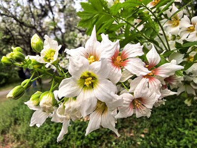 说 明:文冠果树在北京少有种植,其数量屈指可数。开花季节,远观凝霜挂雪,如白云在树间飘浮。五个花瓣白如玉,含丹蓄翠。我几乎转遍了植物园南园的蔷薇园,才找到仅有的三棵树。