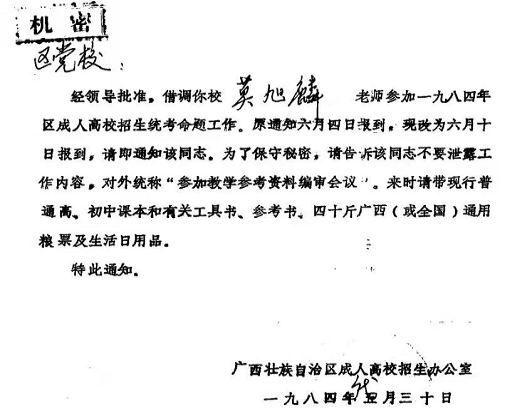 回到党校不足一个月,哲学教研室曾主任对我说,经校领导慎重研究决定,交给我一项重要任务。完成这项任务,需要离家一段时间。他问我有没有什么困难。当我回答没有困难,有困难亦可自己克服,之后,他递给我一张参加全1984年全区成人高校招生统考命题的通知书。这是一张由自治区成人高校招生办公室发出的盖有“机密”字样的通知书。这张通知书对参加命题人员有以下规定: