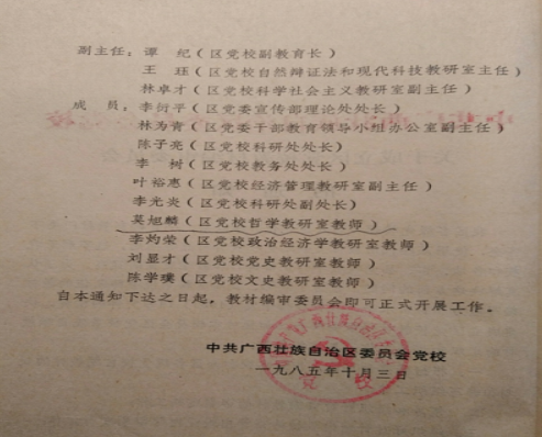从西园饭店回来后,党校发了一个题为《关于成立广西党校教材编审委员会的通知》,列出十四名委员,其中有两位副校长,一位教育长,此外还有一位是宣传部理论处处长,一位干部教育领导小组办公室主任以及本校各教研室主要领导人。教材编审委员会十四名委员中,只有我和陈学璞、刘显才三人为普通教员。那时,广西党校尚未建立学术委员会。教材编审委员会实为即将建立的学术委员会的前身。
