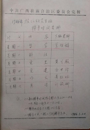 在党校教育正规化口号的引导下,广西校决定开办研究生班。为了帮助考生复习应考,学校专门成立了一个辅导机构,由校领导指定并安排教师对报考者进行考前辅导。我被指定为哲学学科辅导教师,至今保留有当年教务处打印的“报考研究生班辅导时间安排表”。