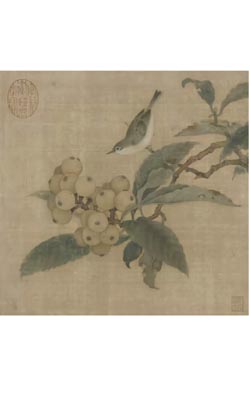 一只俊俏的小鸟立于枇杷枝上,伸着尖细锋利的嘴巴,紧瞅着爬在枇杷上的蝼蚁。生动细密的构图,使画面富有浓郁的生活情趣。林椿以精雕细刻的画笔,对花果、鸟、虫的形象都作了生动的描绘。
