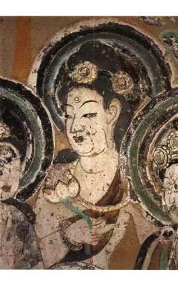 敦煌壁画虽然经过岁月的洗礼,曾经的鲜艳已经黯然,曾经的清晰已经模糊,但是,却无声胜有声,仍在默默地诉说着古人对理想世界的描述。斑驳不齐的画面,断断续续的线条,形成一种斑驳、残缺的效果。这种效果不仅没有影响壁画的美感,反而形成一种意想不到的斑驳美。