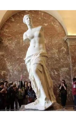 维纳斯雕像:身材端庄秀丽,肌肤丰腴,美丽的椭圆形面庞,希腊式挺直的鼻梁,平坦的前额和丰满的下巴,平静的面容,流露出希腊雕塑艺术鼎盛时期沿袭下来的思想化传统。她那微微扭转的姿势,使半裸的身体构成一个十分和谐而优美的螺旋形上升体态,富有音乐的韵律感,充满了巨大的艺术魅力。