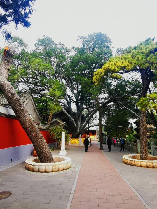 这一年,秋高气爽,万山红遍,我们开车来到了戒台寺。一下车,我们就看到戒台寺牌楼前有一块古石,赫然屹立在花坛的草木丛中,“戒台寺”三个遒劲大字显得格外庄严肃穆。据说戒台寺已有千年的历史,出家人依戒法规定在戒坛受持此戒,方能取得正式僧尼资格。