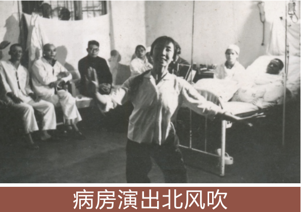 我们几个“文艺骨干”商议后,很快确定了几个节目。叶爱平的手风琴和扬琴独奏、明晓燕跳芭蕾舞蹈《北风吹》、我跳了一曲《一条大河》。那会没有录音带的歌 曲和音乐,我们跳舞的时候,叶爱平伴奏,其她同学都在后面伴唱。白建平和夏向南创作了一个具有闽南特色的刮板小曲《唱唱我们的……》, 由白建平、夏向南、范晓宁和我四个人表演,最后16位同学一起合唱《我是一个兵》《打靶归来》。演出地点安排在一个大病房里,不能行走的病人把病床推进来,病房里、窗台上、门外到处挤满来了看演出的患者和工作人员,每演完一个节目掌声热烈,病房内外一片欢声笑语。这次演出得到了矿物局工会和医院领导的赞扬和支持,决定抽调医院的医护人员和我们班同学一起排演了一台节目,到各个分厂矿巡回演出。
